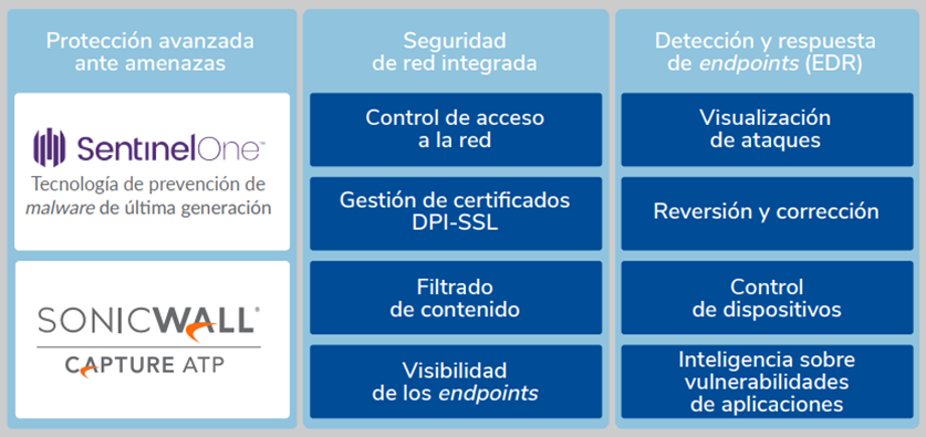 Es el equivalente a un Antivirus + EDR de nueva generación + Firewall + Solución para remediar infecciones, basado en una Inteligencia Artificial diseñada por Sentinel One con las siguientes características: